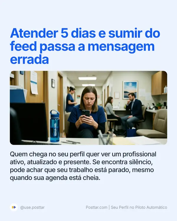 Sua constância não depende mais de inspiração. A Posttar cria, agenda e publica pra você, todo dia. Conectou o Instagram, ligou o piloto automático.
