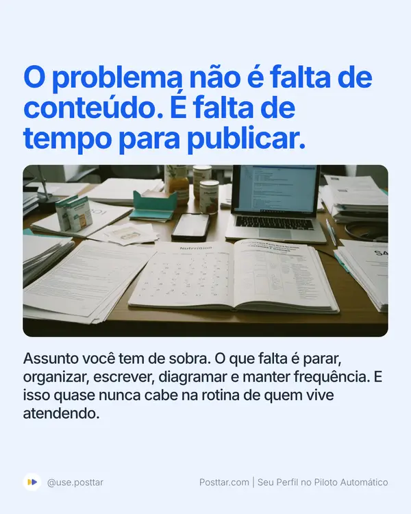 É automático de verdade. A Posttar gera os textos, cria as imagens, monta os carrosséis, revisa e publica no seu perfil, tudo sozinha. Se quiser colocar a mão em alguma coisa, fique à vontade: dá pra trocar imagens, reescrever textos e ajustar qualquer slide antes de ir ao ar. Você decide o quanto quer intervir.