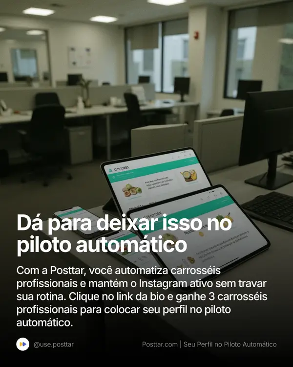 É automático de verdade. A Posttar gera os textos, cria as imagens, monta os carrosséis, revisa e publica no seu perfil, tudo sozinha. Se quiser colocar a mão em alguma coisa, fique à vontade: dá pra trocar imagens, reescrever textos e ajustar qualquer slide antes de ir ao ar. Você decide o quanto quer intervir.